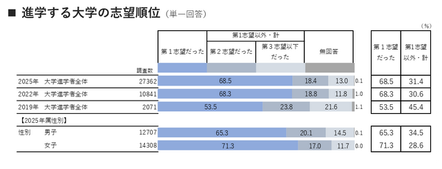 調査によると、第1志望校への進学者は68.5%で、2022年の前回調査からほぼ横ばい。「年内入試」(総合型・学校推薦型選抜)合格での進学者は53.4%と過半数にのぼり、「年明け入試」(一般選抜・共通テスト利用入試)を9.2ポイント上回った。自身の進路選択に納得しているかを尋ねた設問では、合計で87.2%が「そう思う」と回答。特に「年内入試」利用者では91.9%が納得していると回答した。