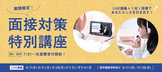大学受験予備校「四谷学院」は2025年9月より、大学の推薦入試(総合型選抜等)や医学部をはじめとする2次試験で面接が課される受験生を対象とした「面接対策特別講座」を開講する。受講申込みは7月21日より先着順で受付を開始する。