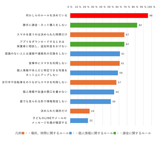 設定しているルールを学年別にみると、小1~小3の1位は「スマホを使うのは決められた時間だけ」で、小4~小6・中学生は「勝手に課金・ネット購入をしない」となった。学年問わず、課金に関するルールは多く、低学年では時間や場所に関するルール、高学年になると個人情報に関するルールが多くなる傾向がみられた。