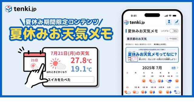 天気予報専門メディア「tenki.jp」は、tenki.jpメンバーシップの新コンテンツとして2025年7月22日から8月31日までの期間限定で「夏休みお天気メモ」の提供を開始した。日々の天気や気温を簡単に記録・確認でき、小学生の夏休みの宿題にも役立つコンテンツとなっている。