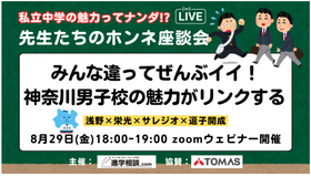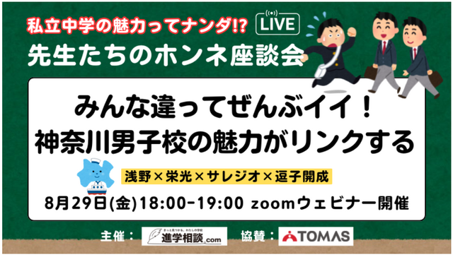 神奈川県屈指の私立男子中学4校の先生によるオンライン座談会「みんな違ってぜんぶイイ! 神奈川男子校の魅力がリンクする」が2025年8月29日に開催される。参加校は浅野・栄光・サレジオ・逗子開成。申込みは進学相談.comへの会員登録と参加予約が必要。