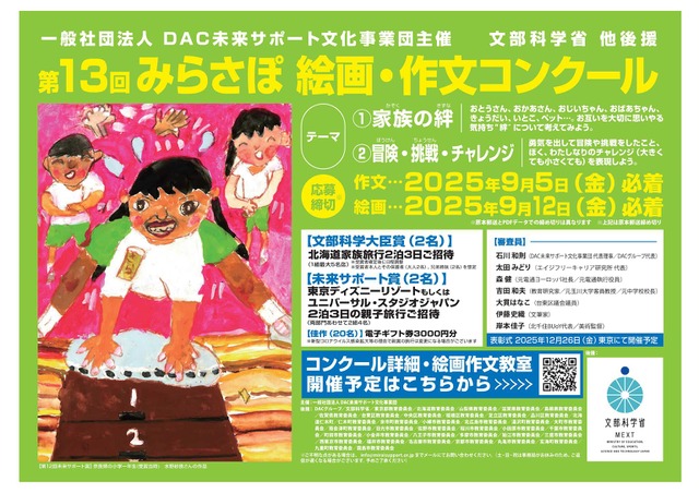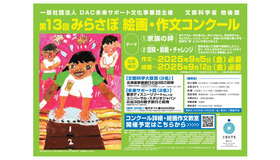 DAC未来サポート文化事業団は、小中学生を対象に「第13回みらさぽ絵画・作文コンクール」を実施する。テーマは「家族の絆」または「冒険・挑戦・チャレンジ」。締切りは作文が2025年9月5日、絵画が9月12日必着。受賞者には北海道、東京、大阪の親子旅行も。