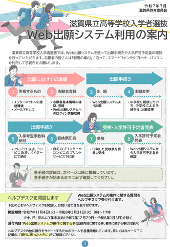 2026年度(令和8年度)滋賀県立高等学校入学者選抜より導入されるWeb出願システムについての志願者向け案内リーフレットが公開された。事前準備から出願手続き、入学許可予定者発表までの手順を掲載している。操作に関する質問ができるヘルプデスクは2025年11月4日に開設予定。