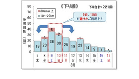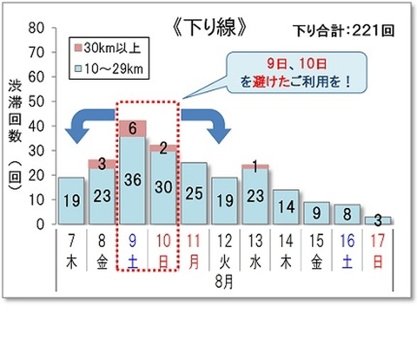 8月16日の関越道(上り線)坂戸西スマートIC付近を先頭とする最大40kmの渋滞では、藤岡JCTから鶴ヶ島IC区間を走行する場合、渋滞のピークは午後4時から午後5時で、渋滞がない場合に比べ約3倍(約1時間30分)の所要時間となる見込み。回避するためには、藤岡JCTを午後1時よりも前または午後11時以降に利用することを推奨。渋滞原因は、坂戸西スマートICの出口手前のサグ部によるもので、無意識な速度低下に注意するよう呼びかけている。