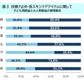 子供に「普段からお化粧(メイク)をしていますか」と問うと、5人に1人が普段からメイクをしていることがわかった。使用アイテムの1位が「化粧下地」で約6割、ついでファンデーション、チークと続き、肌をきれいに見せる効果のあるものが上位になっていた。さらに、メイクを始めた年齢の平均が8.72歳と低学年という結果もあり、ここでも子供の美容に関する意識の高さが見られる傾向があった。