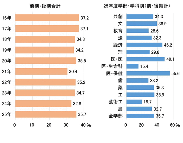 代々木ゼミナールは2025年7月28日、九州大学の入試データ(2025年度)を公開した。一般選抜合格者に占める福岡県出身者の割合は35.7%で、10年連続40%を下回る結果。特に、後期日程全体の県内出身者割合が23.7%と低くなっているという。