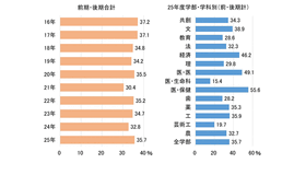特に、後期日程全体の県内出身者割合が23.7%と低くなっている。これは、九州大学がほかの難関国立大学に比べて後期日程を実施する学部が多く、2025年度は共通テストの平均点があがったことにより、前期日程で東京大学・京都大学・名古屋大学・大阪大学にチャレンジした成績上位層の併願先として、全国から受験生が集まったことが要因と考えられるという。