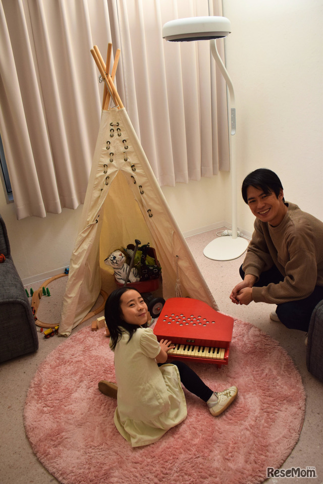 また、手元(ダウンライト)だけでなく天井(アップライト)を照らすことで部屋全体の照度を上げ、手元と周囲の明暗差を減らすねらいがあるという。 センサーによる自動点灯機能や、明るさ・色温度・上下ライトを変える4つのモードが搭載されており、親子での遊び、紙での読書、タブレットなどモニターの閲覧、勉強など子供の成長に合わせた幅広いニーズに対応している。実際に親子での遊びに適した「リラックスモード」で点灯してみると、部屋全体が柔らかく明るくなる印象を受けた。もちろん、自分の好みに合わせて手動で調光することも可能だ。