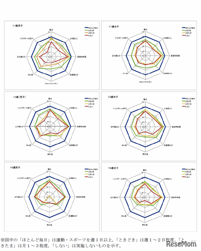 文部科学省実施の「新体力テスト」により、青少年の体力・運動能力は全体に横ばいまたは向上傾向に。また日常的な運動の頻度により、測定結果に大きな差異が生じている。