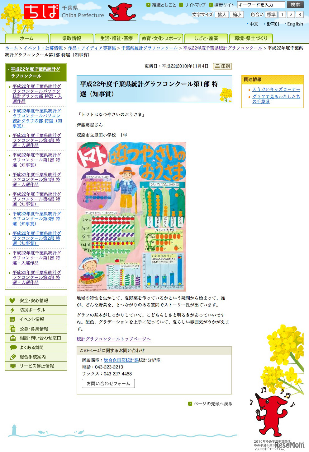 神奈川県と千葉県は、それぞれの平成22年度統計グラフコンクールの入賞者を発表した。入賞作品はそれぞれホームページに掲載中。