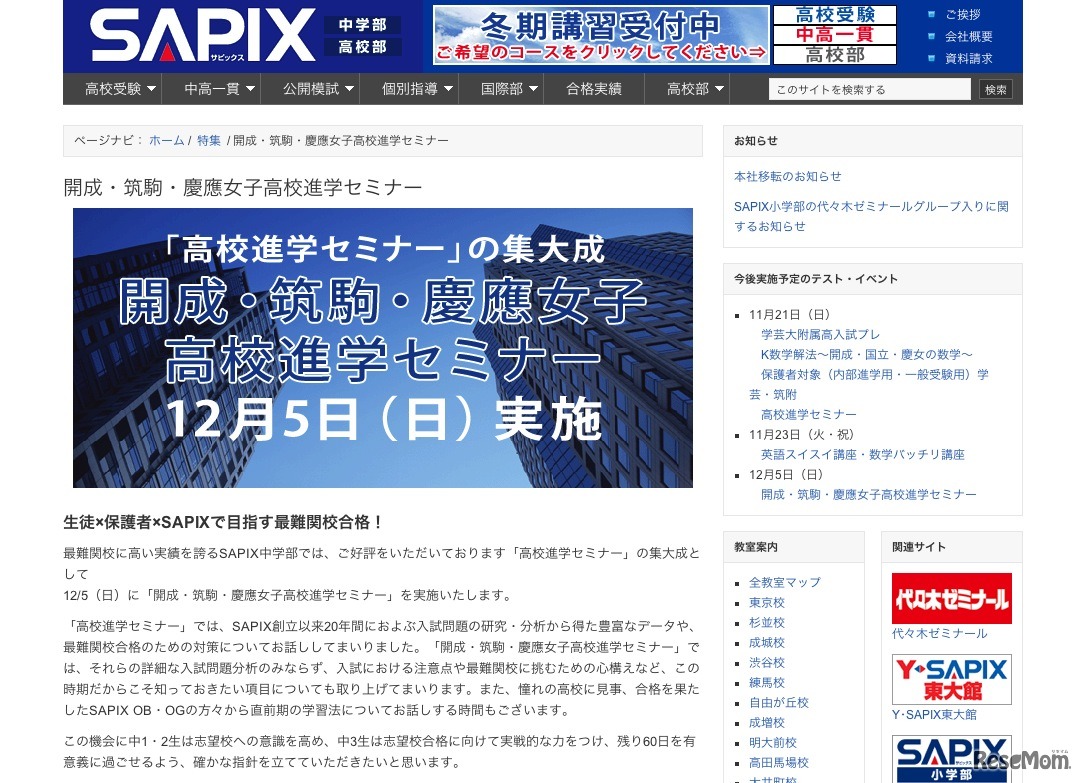 SAPIX中学部では12月5日に、「開成・筑駒・慶應女子高校進学セミナー」を実施する。