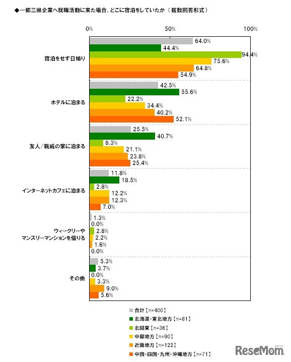 1都3県企業へ就職活動に来た場合、どこに宿泊していたか(複数回答形式)