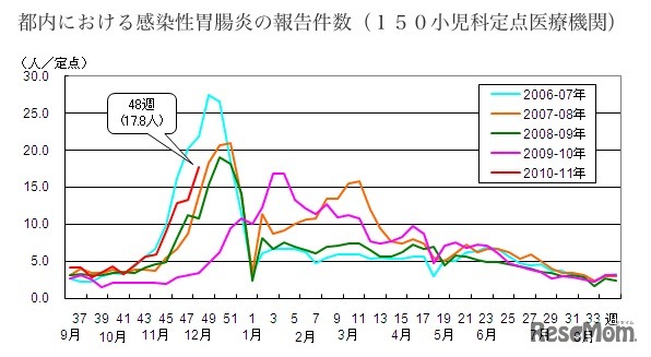 東京都は12月9日、ノロウイルスなどを原因とする感染性胃腸炎は、平成22年第48週(11月29日~12月5日)に都内の患者報告数が流行警報基準に達したと発表した。