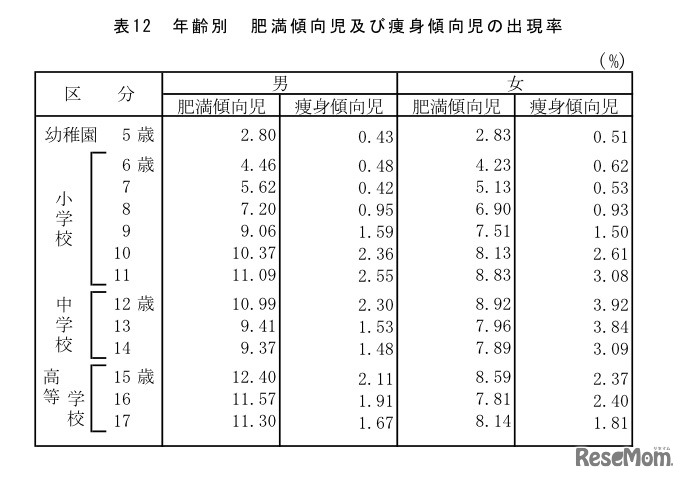年齢別肥満傾向及び痩身傾向児の出現率