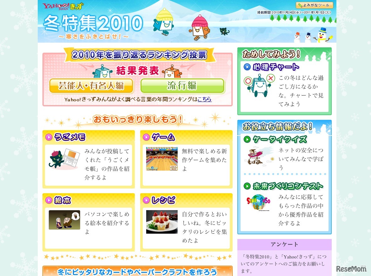 「Yahoo!きっず」は12月20日、「Yahoo!きっず冬特集2010」内で2010年に検索されたワードランキング・2010年を振り返るランキング投票結果を発表した。