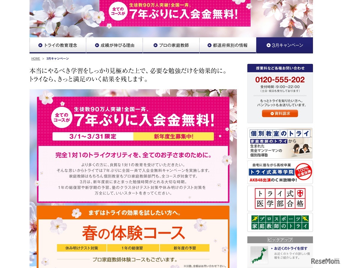 トライグループが運営する家庭教師派遣業の家庭教師のトライでは、3月1日より期間限定で全国一斉の入会金無料キャンペーンを開始した。