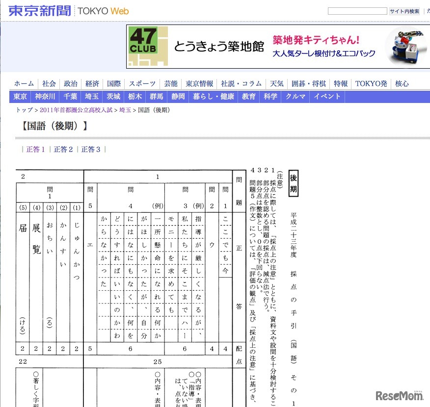 東京新聞は3月4日、「2011年首都圏公立高校入試」のページに、同日行われた埼玉県の公立高等学校の後期募集学力検査の問題と正答を公開した。