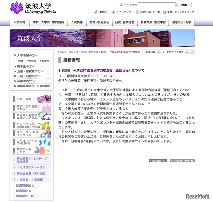 筑波大学は3月14日、東北地方太平洋沖地震の影響を受け、後期日程の個別学力検査等を行わないと発表した。