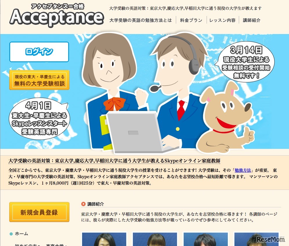 K2は3月24日、Skypeを利用した大学受験英語対策専門オンライン家庭教師「Acceptance(アクセプタンス)」を、3月14日よりサービス開始したと発表した。