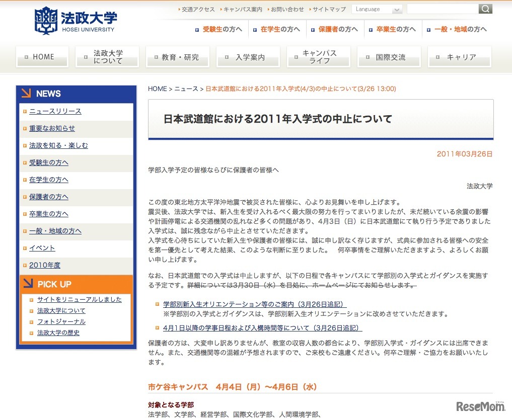 東北地方太平洋沖地震の影響により、首都圏においても入学式を中止または延期する動きが出ていると先日の記事で紹介したが、その後も同様の決定をする大学が相次いでいる。