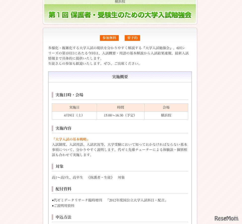 代々木ゼミナールでは4月9日、「第1回保護者・受験生のための大学入試勉強会」を横浜校で開催する。