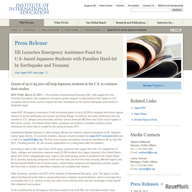 国際教育推進のための非営利機関であるアメリカの国際教育協会(Institute of International Education)は3月23日、最高5,000ドル(約40万円)の奨学金を支給すると発表した。