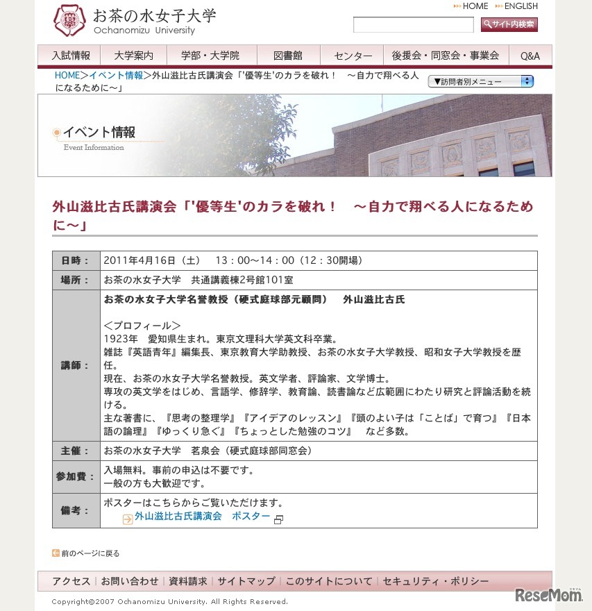 お茶の水女子大学では4月16日、外山滋比古氏講演会「優等生のカラを破れ!自力で翔べる人になるために」を開催する。