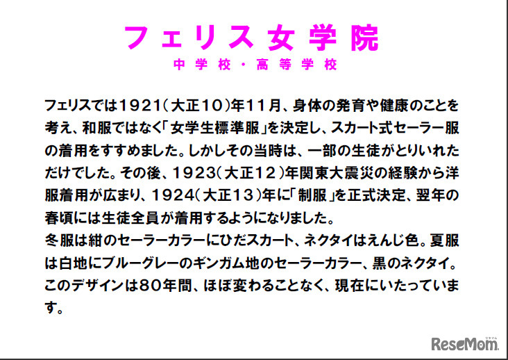 神奈川県私立中学高等学校協会はホームページで、県内の私立中学校・高等学校の制服の特徴や由来を紹介している。