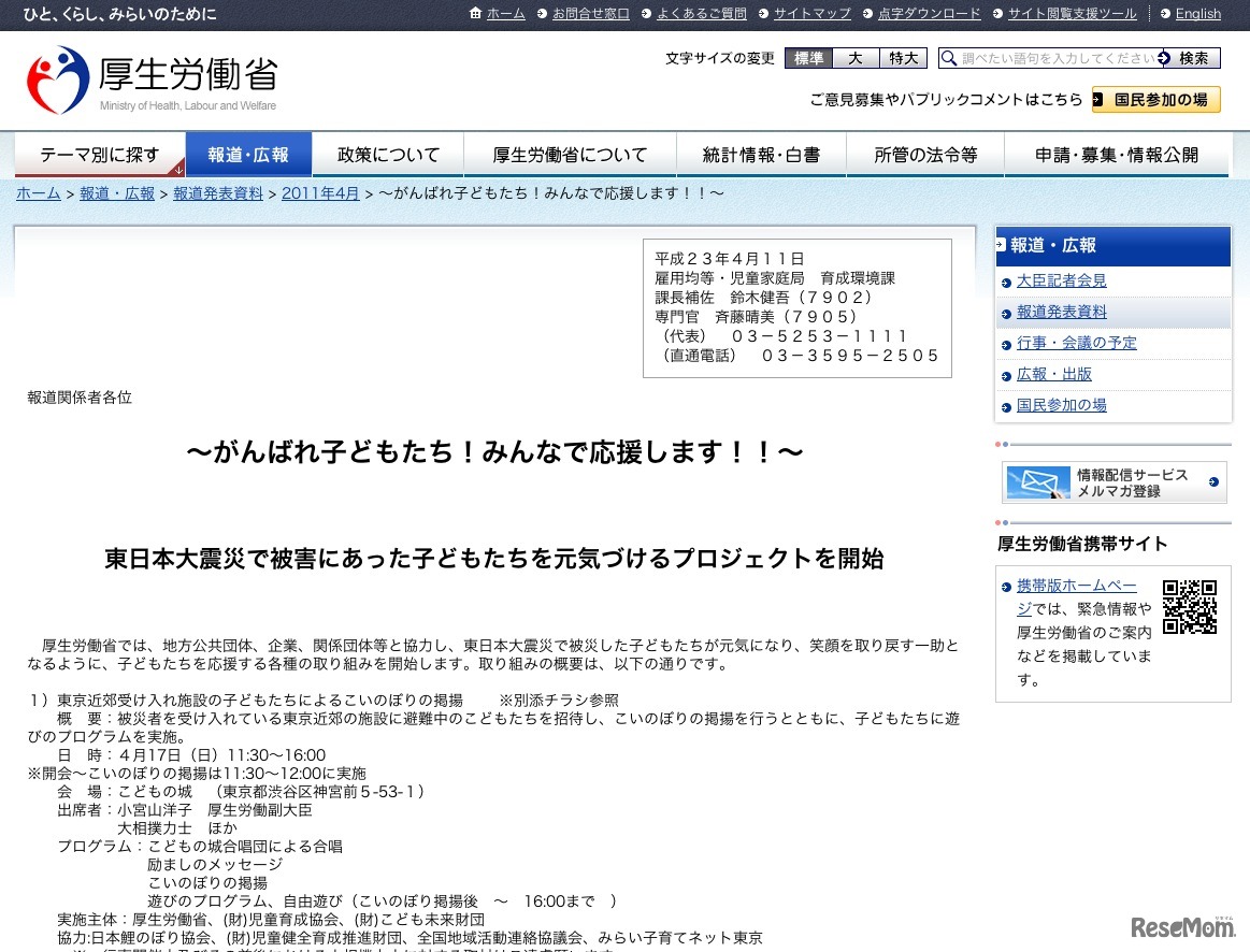 厚生労働省は4月11日、東日本大震災で被害にあった子どもたちを元気づけるプロジェクトについて発表した。
