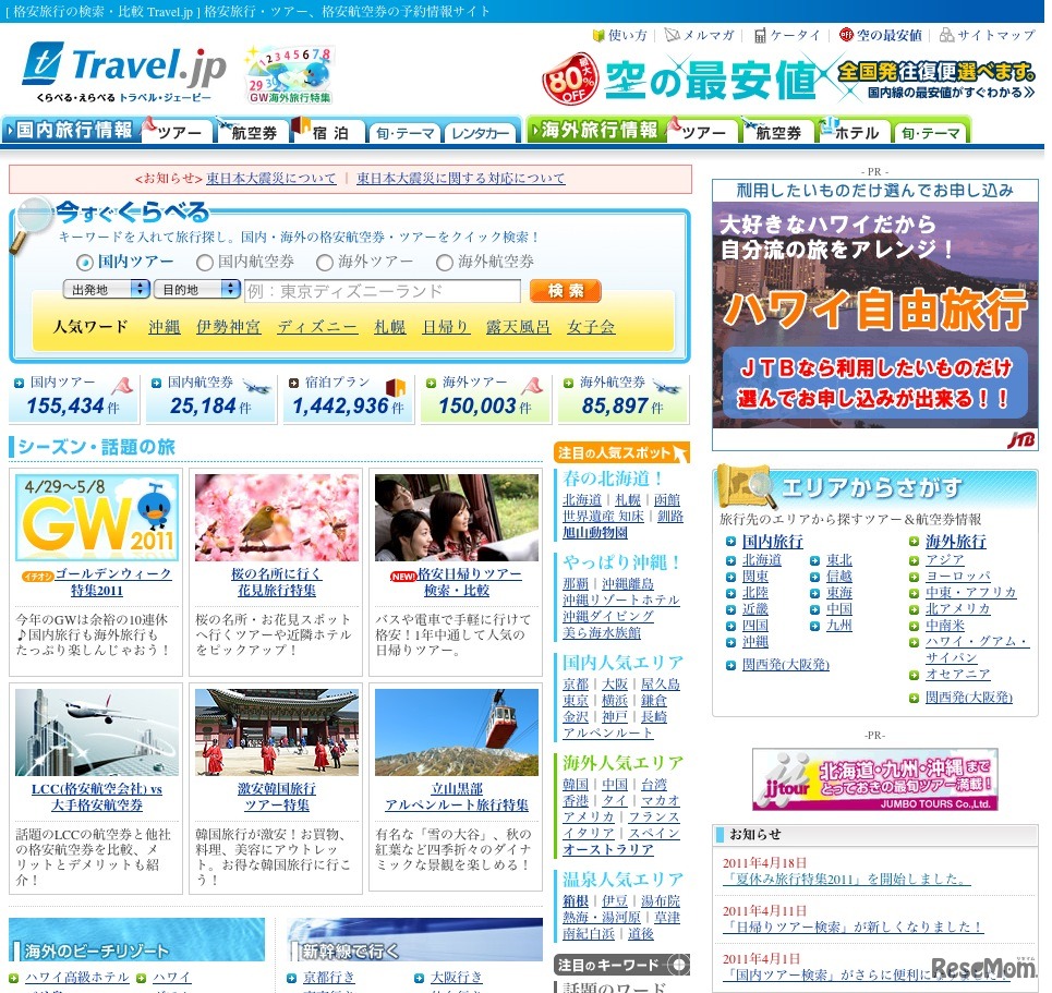 ベンチャーリパブリックは4月22日、旅行の比較ポータルサイト「Travel.jp(トラベル・ジェーピー)」において、「夏休み旅行特集2011」を開始した。