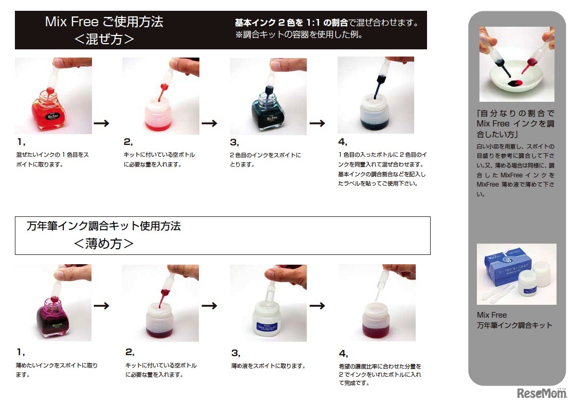 プラチナ万年筆は、自分の好きなインク色を混ぜて作ることができる「Mix Free ミックスフリー」万年筆用インク全9色と「万年筆インク調合キット」を5月13日より販売する。