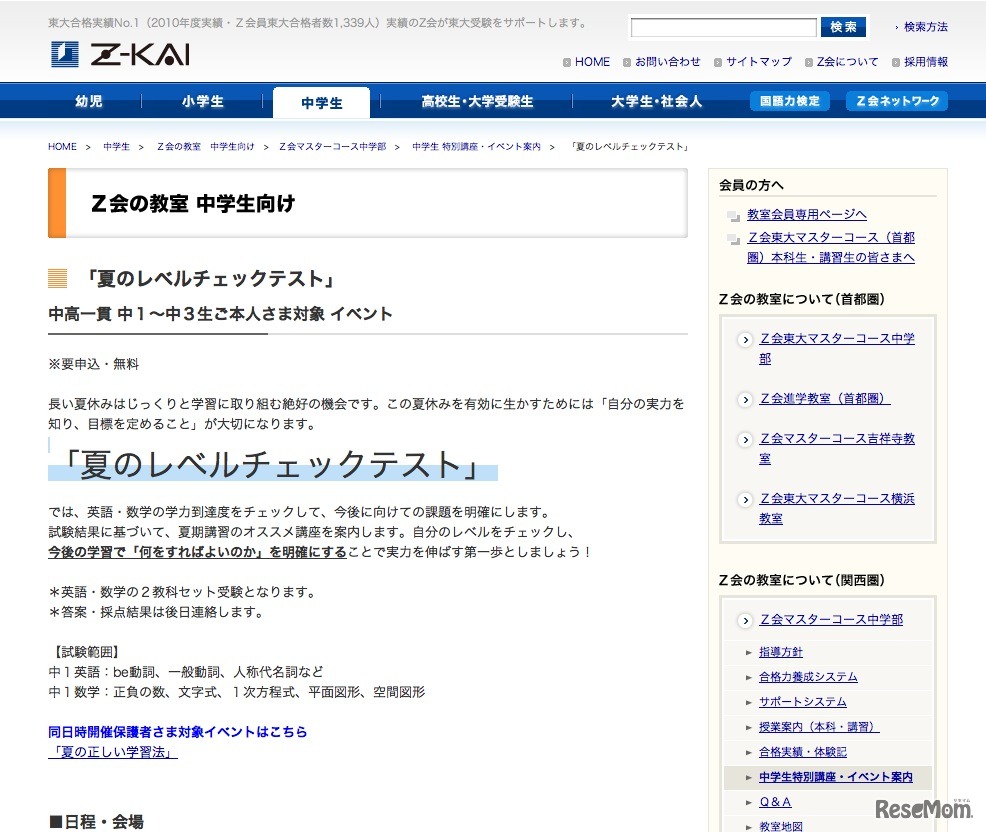 Z会の教室における難関大学を目指す中高一貫校の中学生を対象としたZ会マスターコース中学部では、「夏のレベルチェックテスト」を6月12日より関西の3教室で順次実施する。