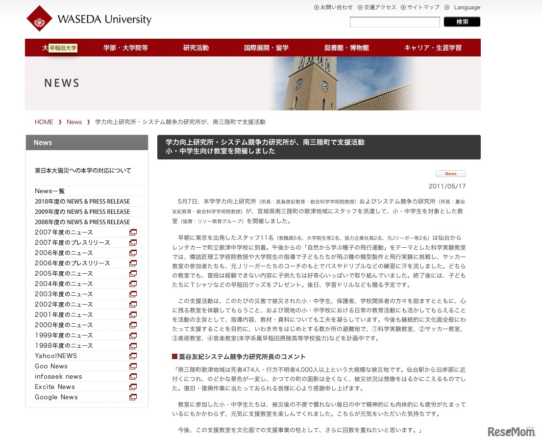 早稲田大学学力向上研究所およびシステム競争力研究所は5月7日、宮城県南三陸町の歌津地域において小・中学生を対象とした教室(協賛:リソー教育グループ)を開催した。