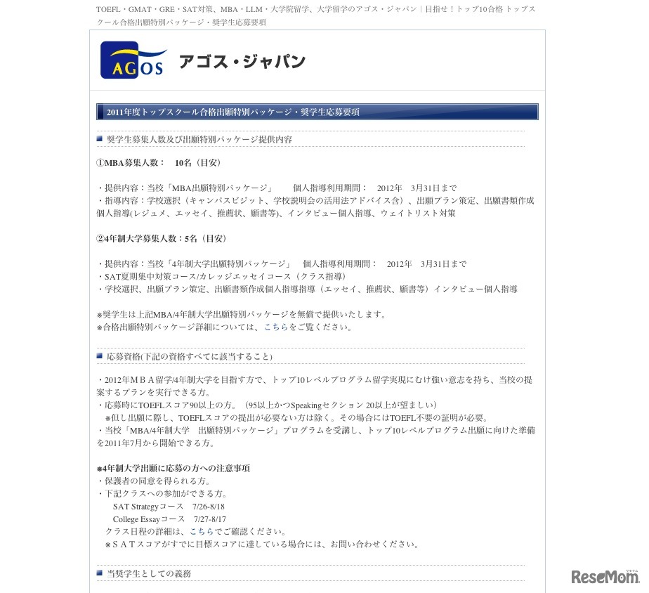 海外大学・大学院留学準備指導校を運営するアゴス・ジャパンは、ハーバード、スタンフォードなどのトップ10スクール合格に向けた「トップ大学MBA/4年制大学出願対策コース」を6月1日から開始する。