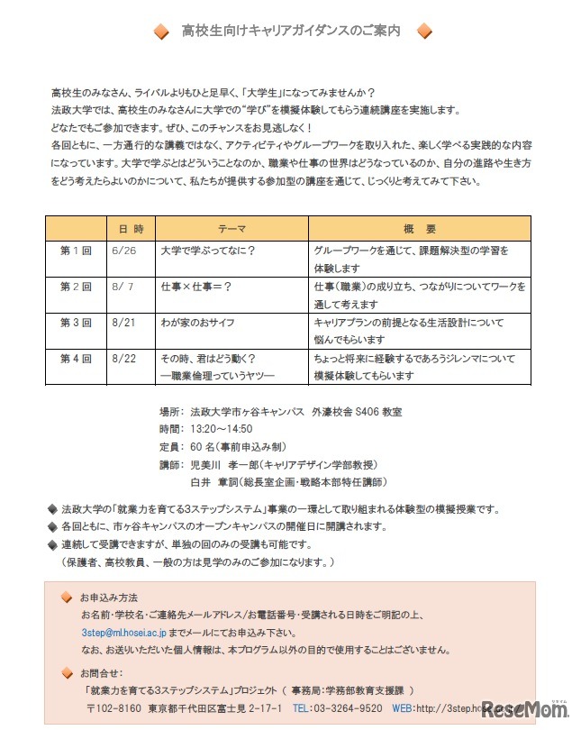 法政大学では、高校生を対象に大学での学びを擬似体験してもらうキャリアガイダンスを実施する。全4回の連続講座で、単独の回のみの受講もできる。