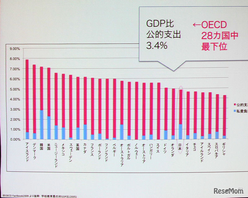 公的な教育予算も低い日本