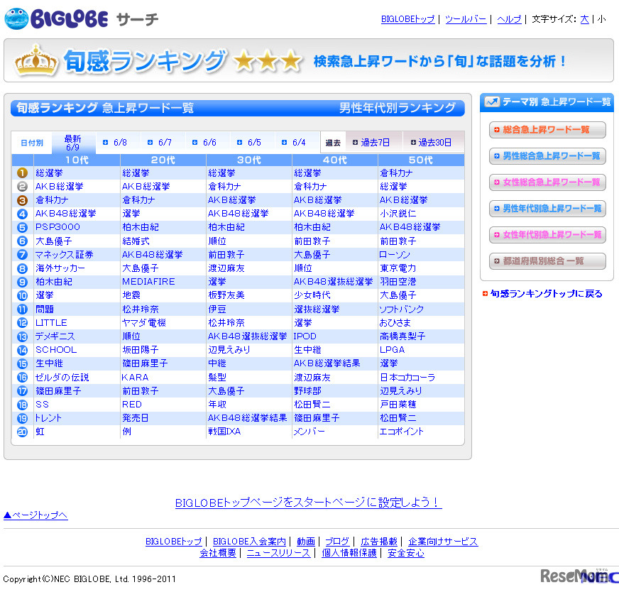 BIGLOBEが検索急上昇キーワードを発表する「旬感ランキング」6月9日の男性年代別では、10代~50代までの公表されているすべての年代で「総選挙」が1位。