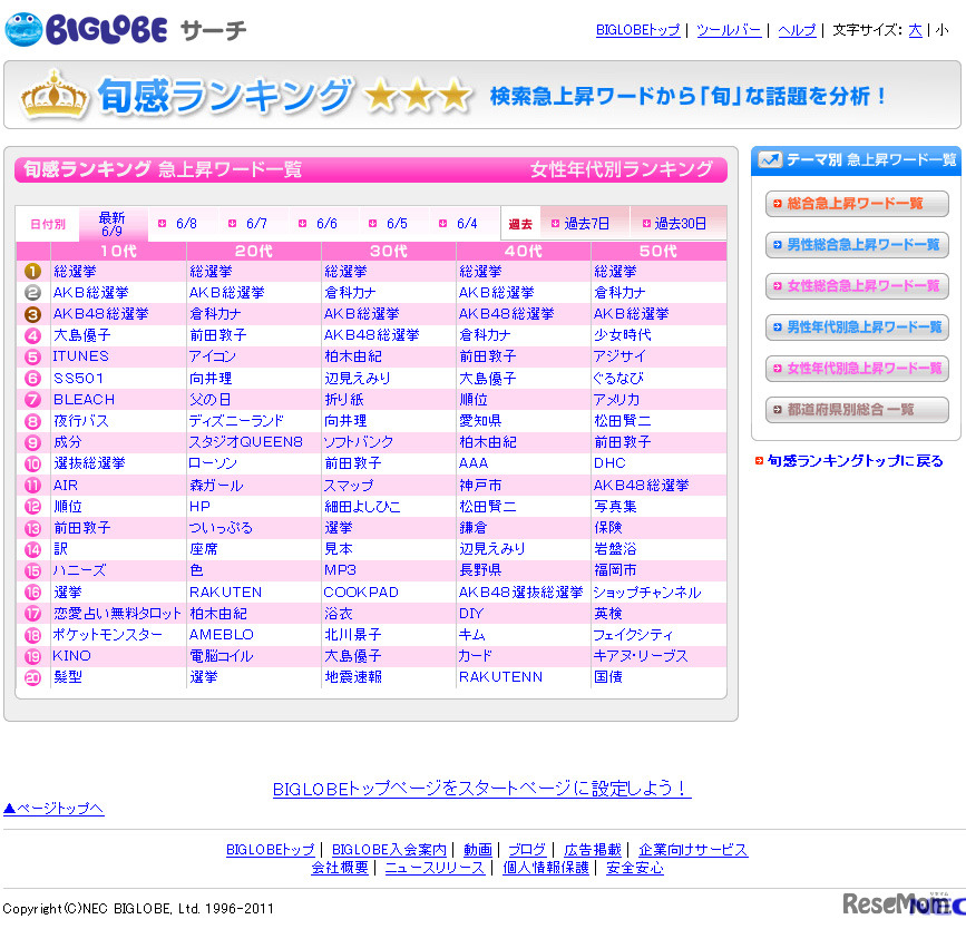 BIGLOBEが検索急上昇キーワードを発表する「旬感ランキング」6月9日の男性年代別では、10代~50代までの公表されているすべての年代で「総選挙」が1位。
