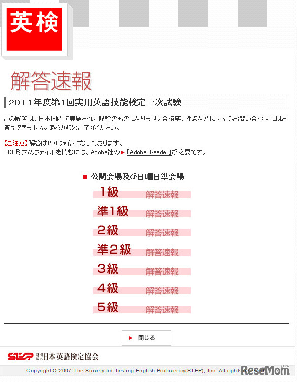 日本英語検定協会は、本会場で6月12日、準会場で6月10日~12日に実施された「2011年度第1回実用英語技能検定一次試験」の解答速報をホームページに掲載した。