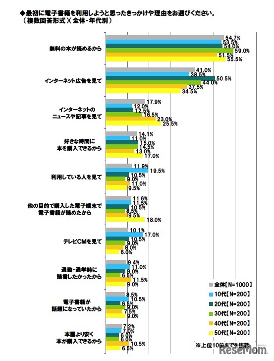最初に電子書籍を利用しようと思ったきっかけや理由をお選びください(複数回答形式)(全体・年代別)