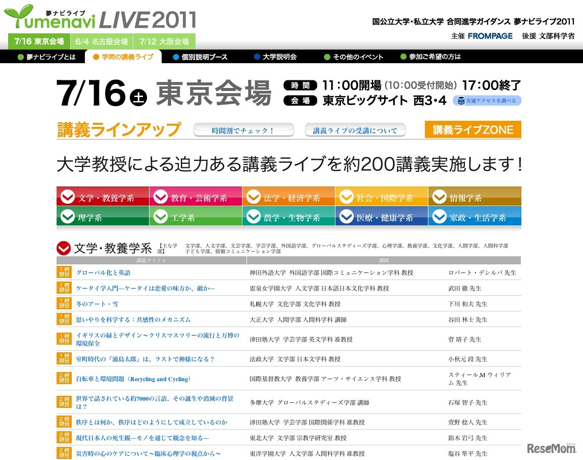 国公立・私立大学合同進学ガイダンス「夢ナビライブ2011」が7月12日に大阪、16日に東京で開催される。