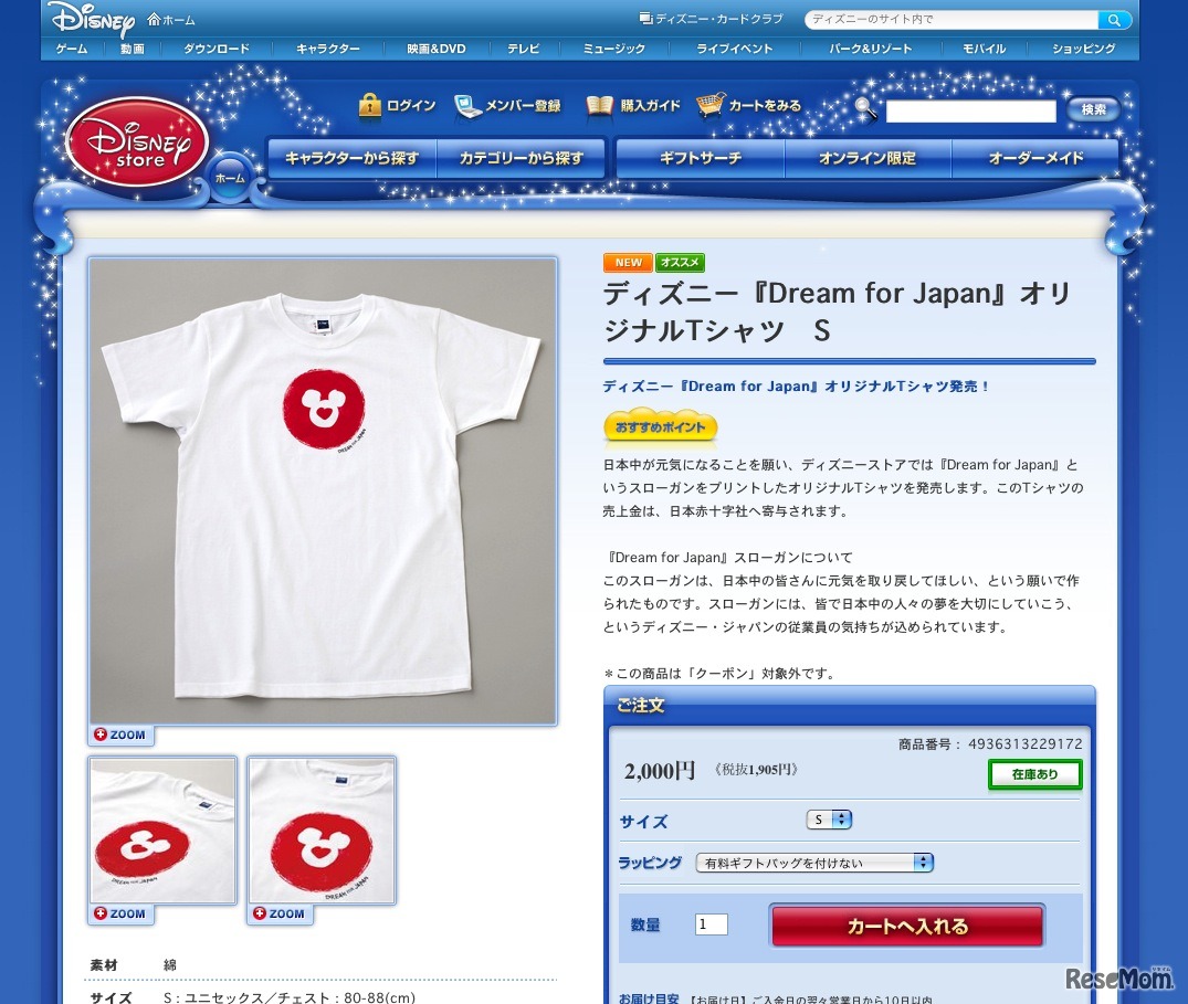 ウォルト・ディズニー・ジャパンは、震災復興の願いを込めた「Dream for Japan」オリジナルチャリティーTシャツを、全国のディズニーストアおよび公式オンラインショッピングにて販売を開始した。