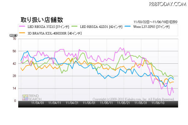 「『液晶テレビ』37~40型モデルの取り扱い店舗数の推移」(「価格.comトレンドサーチ」調べ) 「『液晶テレビ』37~40型モデルの取り扱い店舗数の推移」(「価格.comトレンドサーチ」調べ)