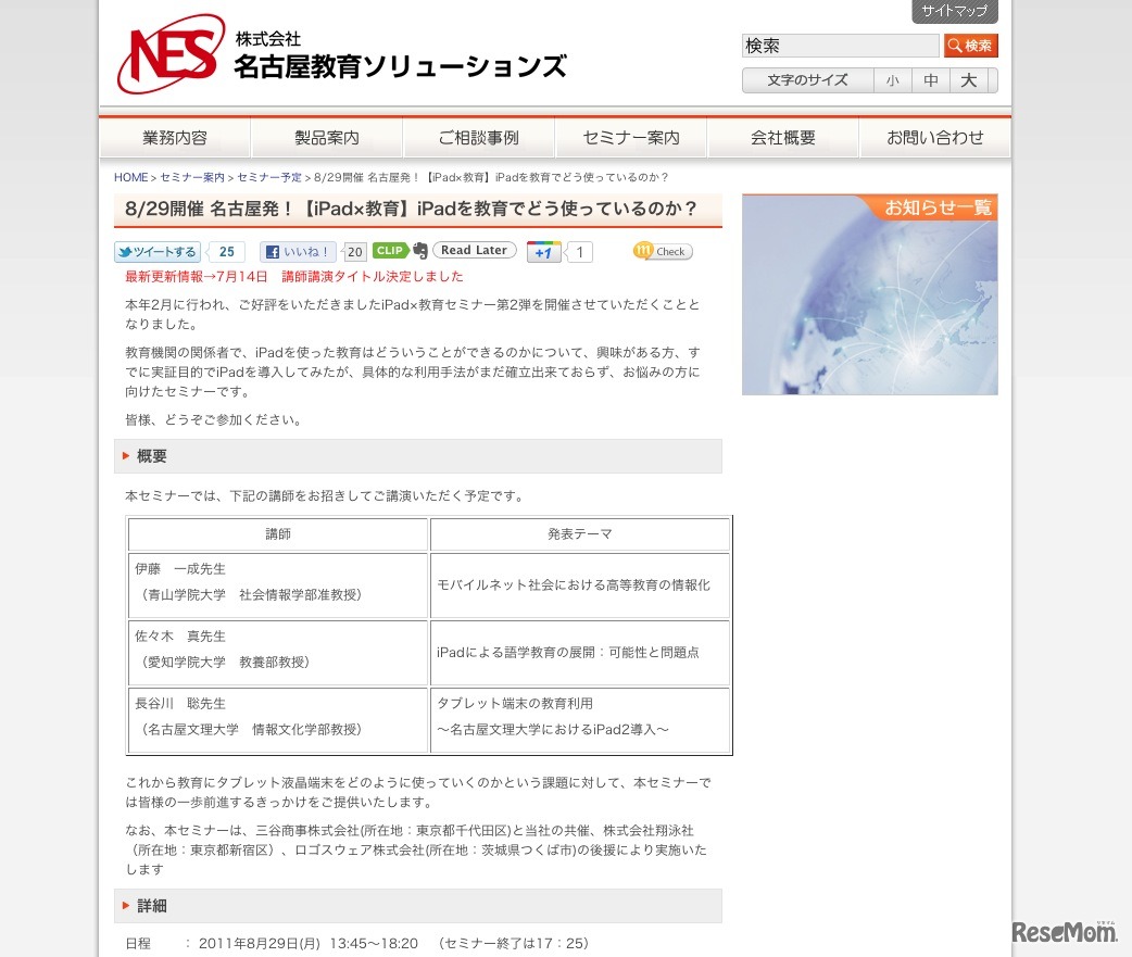 名古屋教育ソリューションズは、教育関係者向けのセミナー「名古屋発!iPad×教育~iPadを教育でどう使っているのか?~」を8月29日に名古屋市にて開催する。