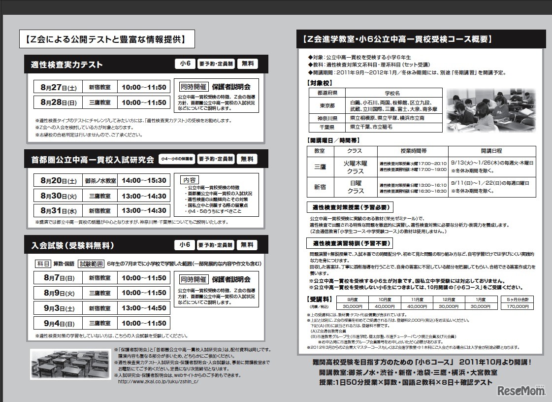 Z会の教室事業を行っている「Z会進学教室」は7月27日、公立中高一貫校の適性検査対策の講座の新規開講について発表した。