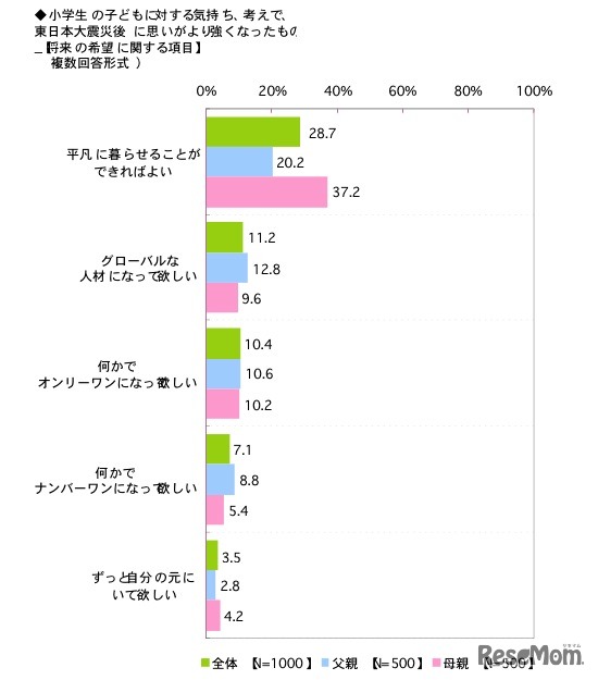 小学生の子どもに対する気持ち、考えで、東日本大震災後に思いがより強くなったもの(将来の希望に関する項目)