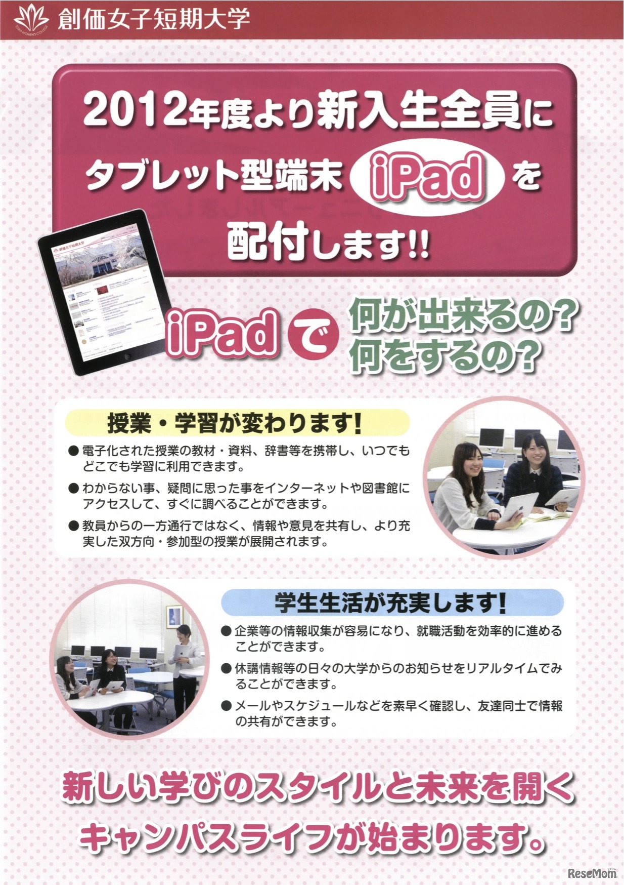 創価女子短期大学は8月16日、2012年度より新入生全員にiPadを配布すると発表した。iPadを学部単位でなく全学で導入するケースは、国内初となるという。