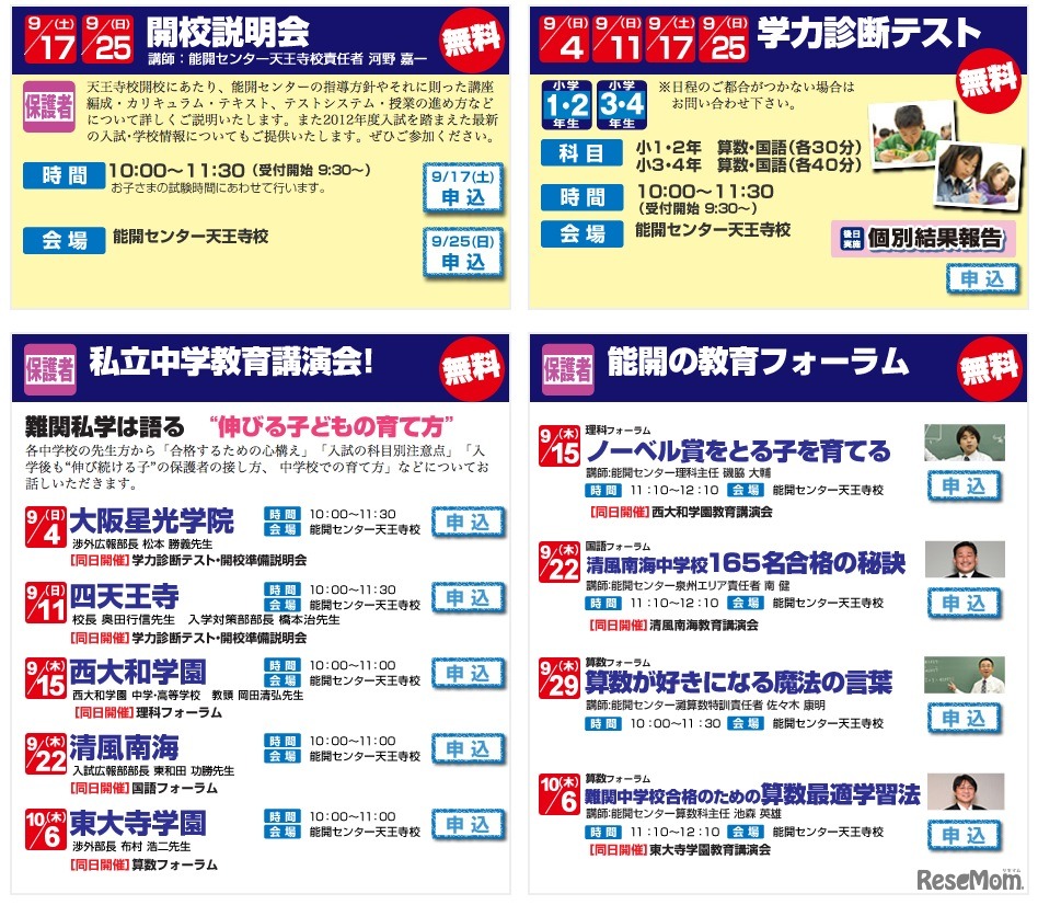 開校説明会、学力診断テスト、私立中学教育講演会、能開教育フォーラム