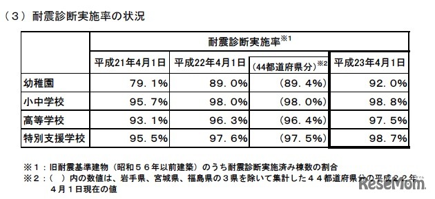 文部科学省は8月24日、平成23年度「公立学校施設の耐震改修状況調査の結果」についてホームページ上で公表した。