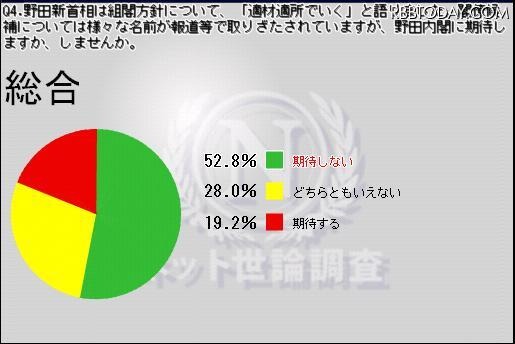 野田佳彦新首相が誕生したのを受け、ニコニコ動画が「ネット世論調査」を8月31日に実施。野田佳彦新首相を「支持する」は13.9%、「支持しない」は32.5%という結果となった。